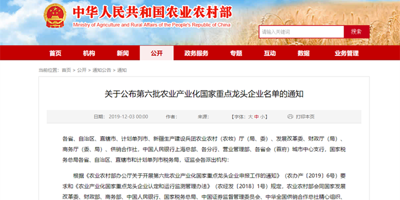 12月3日,农业农村部、国家发展改革委、财政部、商务部、中国人民银行、国家税务总局、中国证券监督管理委员会、中华全国供销合作总社联合印发通知,公布第六批 299 家农业产业化国家重点龙头企业名单,龙江新利手机入口官网-新利(中国)公司榜上有名。